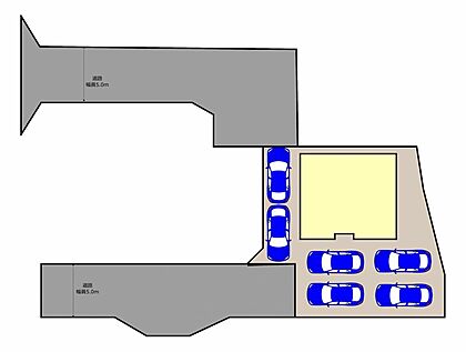【敷地図】前面道路は西側で幅員約5.5mございます。交通量が少ないため、運転が苦手な方でも安心して駐車することができます。駐車は並縦列で6台停められます。
