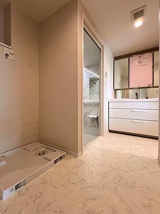 まるでホテルを連想させる様な広々とした洗面室。大型収納も備え付けのワイドタイプの洗面台は使い勝手がよく、朝の忙しい時間も快適に利用可能です。