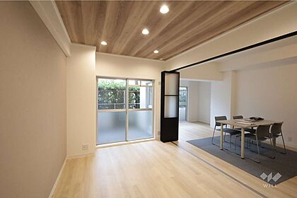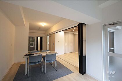 LDK約14.5帖の縦長リビングのプラン。バルコニーに面しており、採光良好です。隣接する洋室約6帖とつなげて広く使うことも可能。