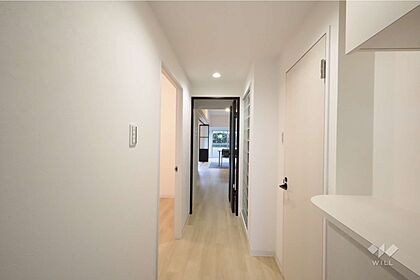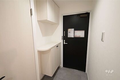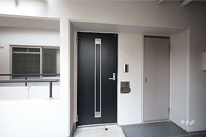 物件の玄関です。TVモニター付きインターホンがあり、訪問者の顔が確認できるので安心。
