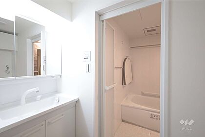 洗面室は、2025年4月にリフォーム済み。三面鏡やシンク下に収納スペースあり。