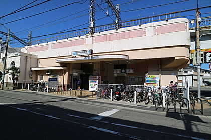 パレ住吉川の外観(北西側から)。JR住吉駅から徒歩8分にあるマンション。複数沿線利用可能な好立地。中学校まで少し距離がありますが、小学校・公園などが徒歩5分圏内の場所にあります。
