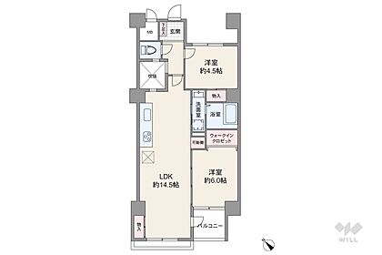 間取りは専有面積56.72平米の2LDK。LDK約14.5帖の縦長リビングのプラン。全居室に窓と収納が付いています。バルコニー面積は5平米(概算)です。