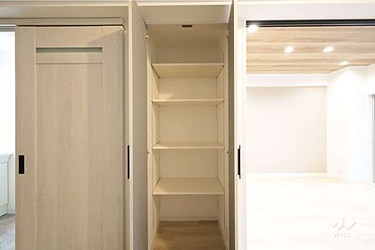 LDKに設置されている収納スペースです。可動棚になっているので、用途に合わせて高さを変えることができます。