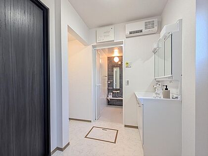 【洗面脱衣室】洗濯機を置いてもゆとりある広さの洗面脱衣室です♪洗面台の三面鏡裏には小物がしまえる収納スペースもございます♪(2025年2月撮影)