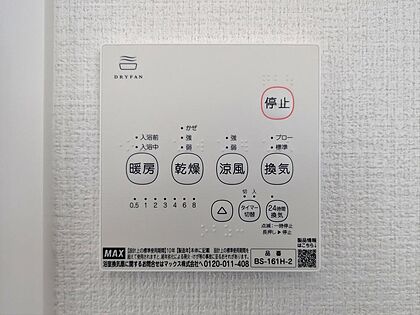 入浴後の水滴や湿気を排出し、カビの発生や臭いを抑制する換気乾燥暖房機です。雨の日の洗濯物にも効果的です。(2025年2月撮影)