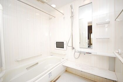 白を基調にした明るく清潔感のある浴室。浴室テレビや浴室乾燥機など便利な設備が揃い、快適です。【浴室】