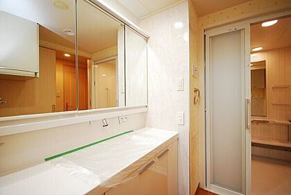 3面鏡付きの洗面化粧台。鏡裏やボウル下に収納がございます。洗面所は廊下・キッチンの2WAY仕様です。【洗面所】