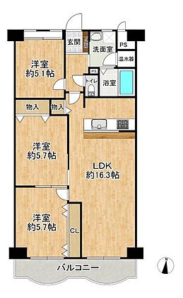 【洋室(約5.7帖)】真ん中のお部屋。クローゼットもあるのでスッキリ片付けられます