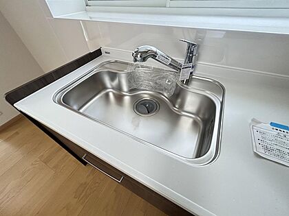 【リフォーム完成済】新品交換したキッチンのシンクはサビにくく熱に強いステンレス製です。水はねの音を抑える静音設計で、従来よりもさらに水音が静かになっています。