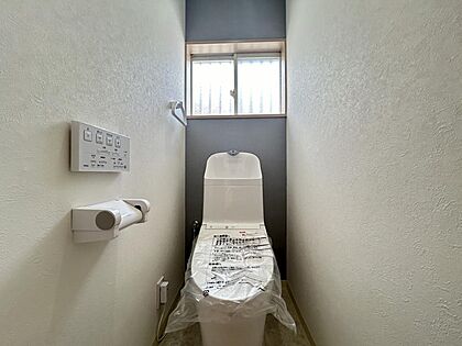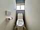 【リフォーム完成済】1階トイレ写真。新品トイレに交換しています。クッションフロア、クロス張り替え、照明交換で清潔感のあるトイレにリフォームしています。温水洗浄機付の便座ですよ。