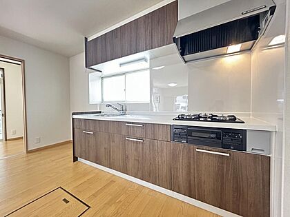 【リフォーム完成】新品交換済みのキッチンは3口コンロで同時調理が可能。大きなお鍋を置いても困らない広さです。お手入れ簡単なコンロなのでうっかり吹きこぼしてもお掃除ラクラクです。
