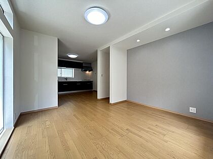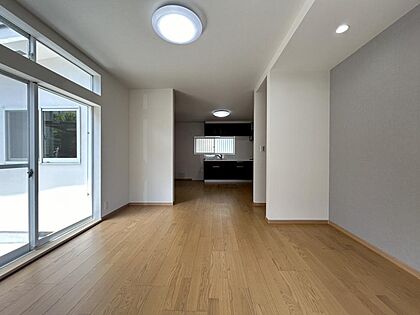 【リフォーム完了済】キッチン側から撮影しています。天井・壁はクロス張替えを行い、フローリング重張りを行いました。南西向きのリビングは1日中日当たり良好です。採光面が大きいリビングは家族団らんのスペース