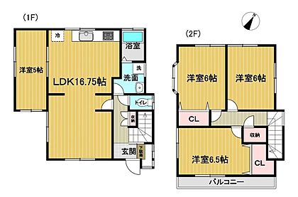 【リフォーム完成済】リフォーム完成後の間取り図です。1階は約16.75帖のLDKと約5帖の洋室、2階は約6帖の洋室が2部屋と約6.5帖の洋室がございます。