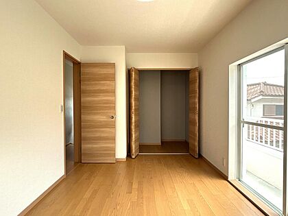【リフォーム完成済】2階南側約6.5帖の洋室です。クローゼット側から撮影しています。床はフローリング重張りを行い、壁・天井はクロスの貼り替えを行いました。南東側2面採光のお部屋で日当たりが良いです。新