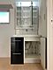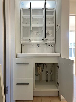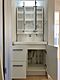 お手入れ簡単設計の洗面化粧台です。三面鏡の裏面がすべて収納になっています。ランドリー収納も設置してあります!