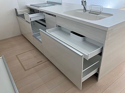 開放的な対面式のペニンシュラキッチンは家族とのコミュニケーションがとりやすく、お子様にも目が届いて安心です。食器洗浄乾燥機付、IH電気調理器(グリル付)は火を使わないから安心、扉はソフトクローズ機能付