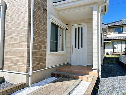 【玄関】外壁の色とマッチしたホワイトカラーの玄関ドアです。屋根があるので雨の日の開け閉めも安心。ドアはクリーニング、鍵は新品に交換しました。