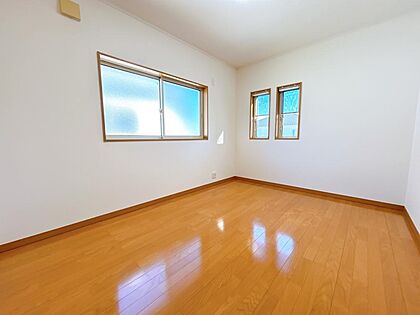 【2階東側洋室】6帖のお部屋です。東と南の二面採光で陽当たりの良いお部屋です。窓は3か所あるので換気もしやすいです。クロスの張り替えと床のクリーニングを行いました。