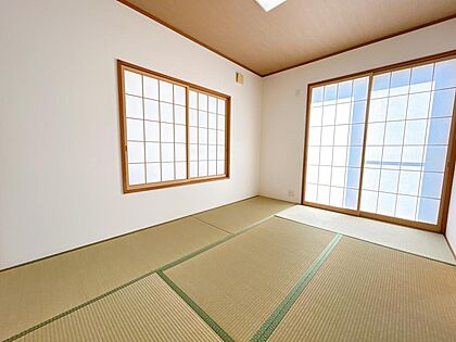【1階和室】別角度写真です。南南窓からは柔らかな陽射しが差し込みます。押し入れ収納もあるので布団なども収納いただけます。ふすまは張り替えを行いました。