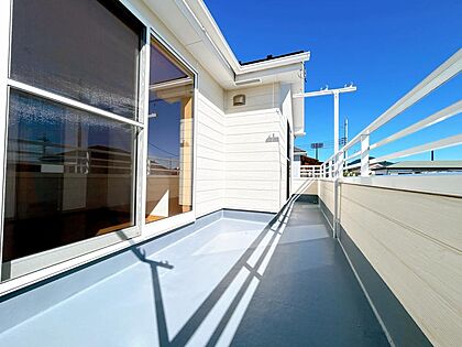 【バルコニー】南東向きのワイドバルコニーです。陽当たりもよくスペースにゆとりがあるので、洗濯物やお布団もしっかり干せる仕様です。床は防水塗装を行いました。