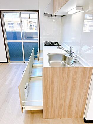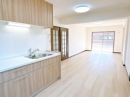 【リフォーム済】新品交換したキッチンは収納も広々。吊り戸棚もありますので収納には困りません。