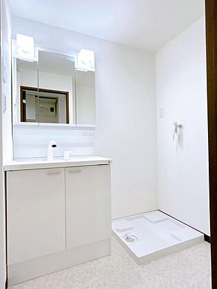 【リフォーム済】洗面化粧台は新品交換しました。クッションフロアと天井・壁クロスの張替も行いました。