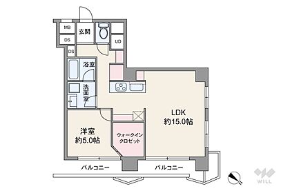 間取りは専有面積50.88平米の1LDK。LDKと洋室がバルコニーに面したプラン。玄関から室内への動線がクランク状で、外から中を見通せずプライバシーを守りやすいのもポイントです。