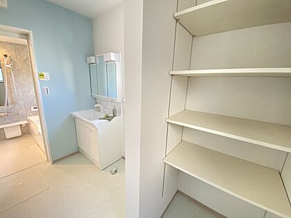 【洗面脱衣室】タオル類やパジャマ、洗濯用の洗剤などの収納スペースが豊富!