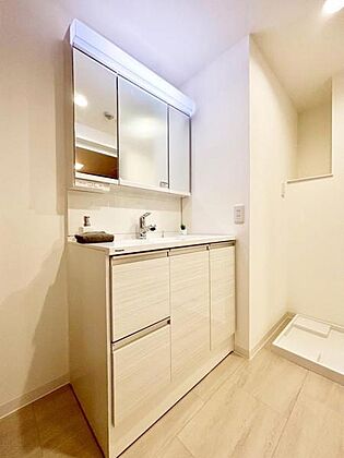 三面鏡の後ろにも収納を設けていますので、洗面ボウルの周りが散らからず、見た目にもスッキリとすることができます。