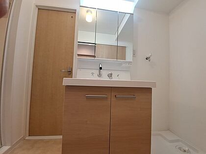 三面鏡の洗面台は、広い視野で身だしなみを整えやすく、収納力も豊富でスッキリとした空間を提供します!
