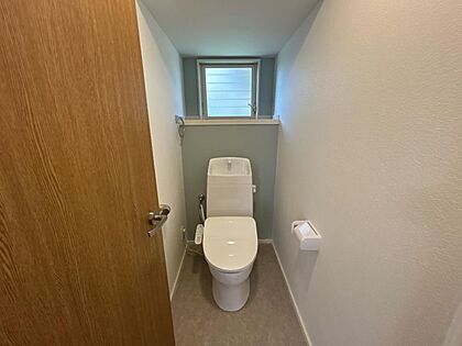【リフォーム済】トイレです。ジャニス社製新品トイレに交換しました。クロス張替え、床クッションフロア仕上げ、照明交換、手すりの新設を行いました。