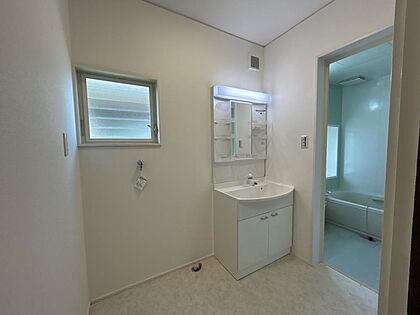 【リフォーム済】洗面台はパナソニックAWE製の洗面洗髪化粧台を新設しました。洗面所はクロス張替え、クッションフロア張り、照明交換、換気扇設置を行いました。