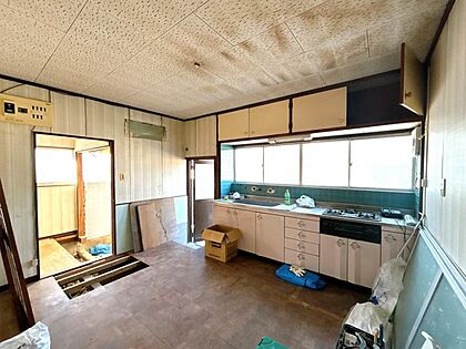 【リフォーム前】13.5帖リビングです。キッチン交換、フロア張り、クロス張り、建具交換、照明器具交換、火災警報器設置を行います。