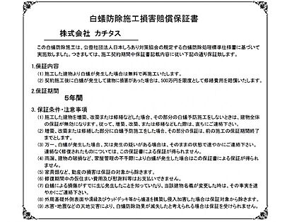 シロアリ防除には5年間の保証付き(施工日から。施工箇所のみ施工会社による保証)