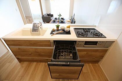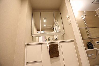 洗面化粧台は一体型の洗面ボウルを使用しているので、お掃除もしやすいタイプです。また三面鏡の裏には収納も有り、小物関係もスッキリ収納が可能です。