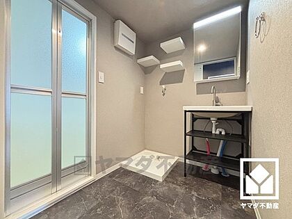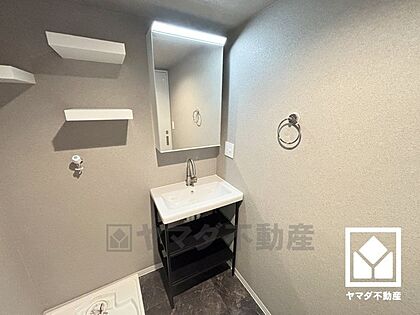 デザイン性の高い洗面スペース。室内洗濯機置場がございますので、天候に左右されず洗濯していただけます。上部に棚があるので消耗品などをスッキリ置けるのも嬉しいポイント。