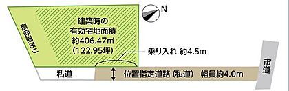 【接道】 一方 ( 私道 東 4m ) ・居住誘導区域外/都市機能誘導区域外・東側道路:乗り入れ幅約4.5m・南側は4.6mの高低差がある為、南側からの乗り入れはできません。・がけ付近の建築物制限により、法面より建築場所を後退する必要があります。・後退に伴う有効宅地は、約406.47?(122.95坪)となります。1項5号道路・南側からの乗入れはできません。・手数料については、媒介業務に要する費用を勘案して算出したものです。 景観法、秋田市中高層の建築に係る紛争の予防および調整の条例 |