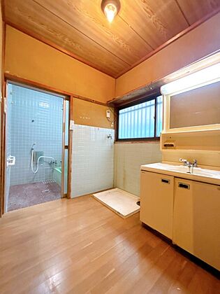 【内外装リフォーム予定】洗面脱衣所の写真です。クロス・クッションフロア張替え新品の洗面化粧台に交換します。
