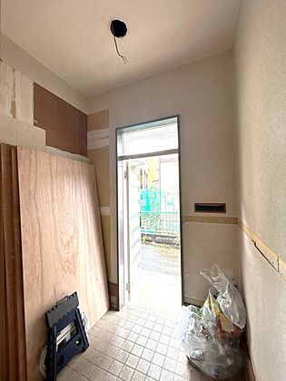 【リフォーム中 10月12日撮影】玄関内部の写真です。シューズボックスを新品交換予定です。これから床はフローリング仕上げ、壁・天井はクロス張替えを行う予定です。