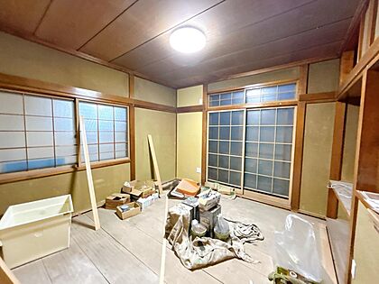 【リフォーム中】1階南側約6帖和室にリフォームする部屋の写真です。畳の表替え、壁天井クロス仕上げ、照明新品交換等を行います。