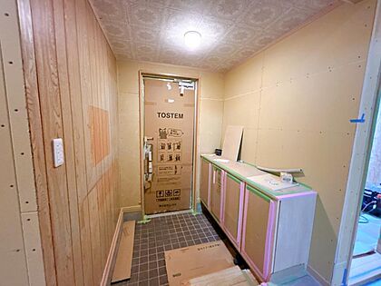 【リフォーム中】玄関ホールです。シューズボックス新品交換、照明新品交換、壁天井クロス仕上げ等行います。