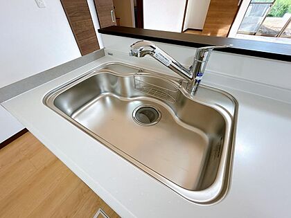 【リフォーム済】新品交換したキッチンのシンクはステンレス製です。熱やサビに強いので清潔感のあるキッチンを維持できそうですね。スタイリッシュなデザインも選ばれる理由の一つです。