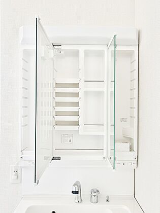 •  三面鏡の裏に、化粧品や衛生用品などを収納可能。洗面台をすっきりと保ちます!