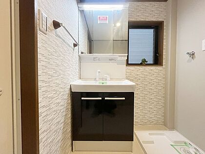 朝の準備が楽にできる独立洗面台です。清潔感のある白で統一され、身支度やお風呂上がり、寝る前の準備などの際に嬉しい大きな鏡付きです。