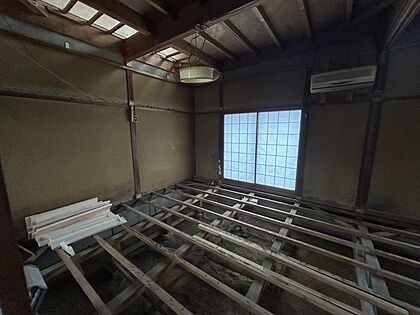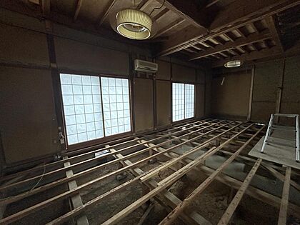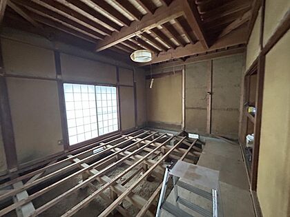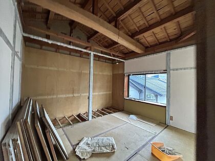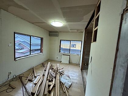 【リフォーム中】2階居室です。床はフロア張替え、壁天井は石膏ボード施工からのクロス張りにしていきます。