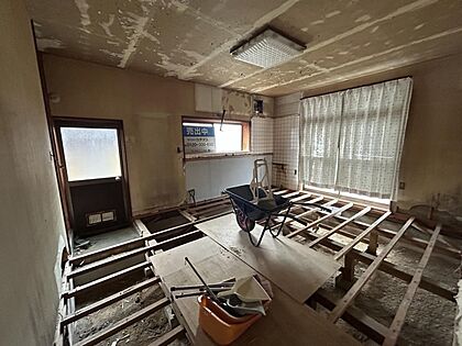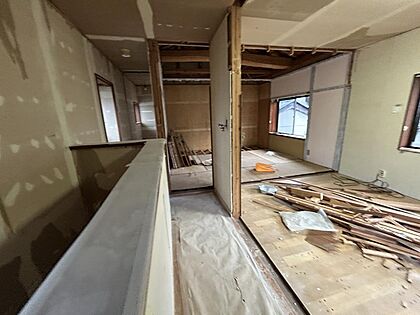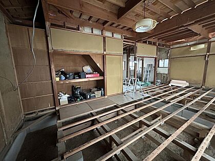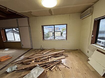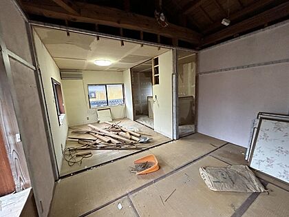 【リフォーム中】1階和室は約17.25帖のリビングに拡張します。床はフロア張替え、壁天井は石膏ボード施工からのクロス張りにしていきます。照明器具や配線器具も新品交換します。
