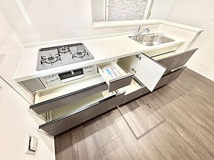 •  ゆとりあるキッチンではご家族と楽しくお料理ができます。