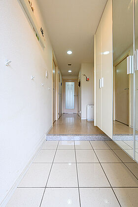 人感センサー付き照明、収納量豊富なミラー付き下足入れ、高級感漂う御影石仕様の上がり框を採用した玄関