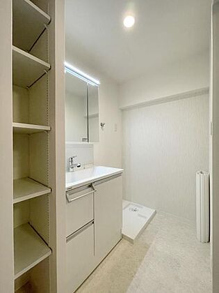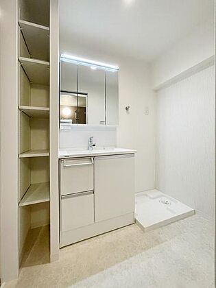 明るく清潔感のある色調で纏められた洗面室は、機能性に富んだ三面鏡の洗面台と採光窓が特徴です♪通気性もよく、洗濯機置場も完備し、家事の動線も配慮されたデザインになっております。